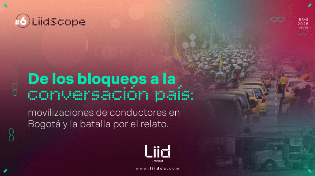 Cuando una protesta local se convierte en tema país: en Liid Scope 6 analizamos cómo la movilización de gremios de conductores en Bogotá pasó de los bloqueos en calle a un debate nacional sobre gobernanza y convivencia.El análisis reveló más de 1.200 menciones, con picos de conversación impulsados por la viralidad emocional y amplificados por […]